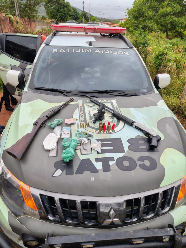 Já em outra parte da operação, na localidade de Santo Antônio, outros dois indivíduos foram presos. Com eles, os policiais apreenderam duas espingardas calibre 12, uma pistola, munições, além de uma balança de precisão, drogas e uma quantia em dinheiro.